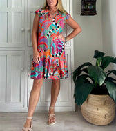 Greek Flutter Sleeve Dress in Blue and Pink Floral